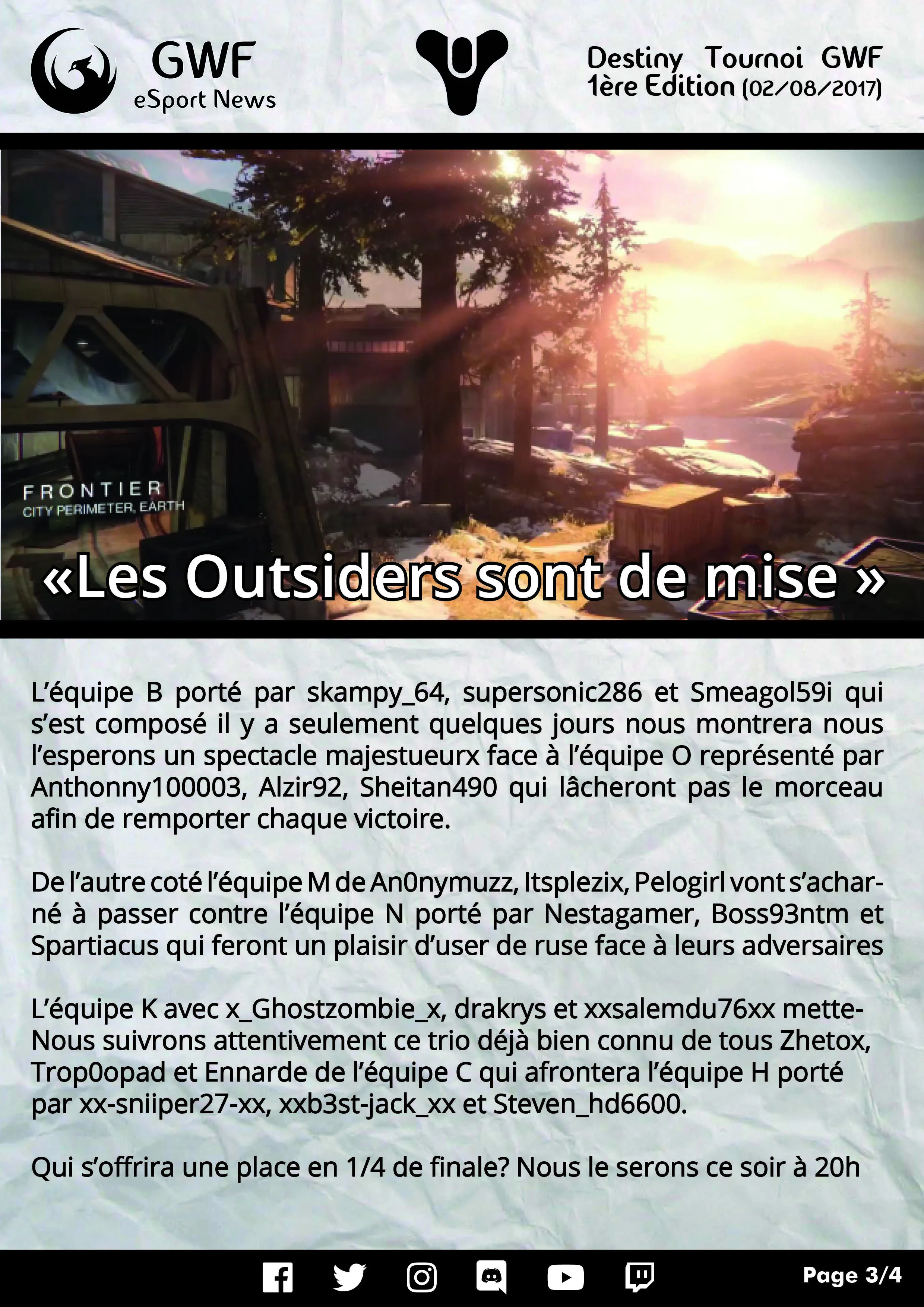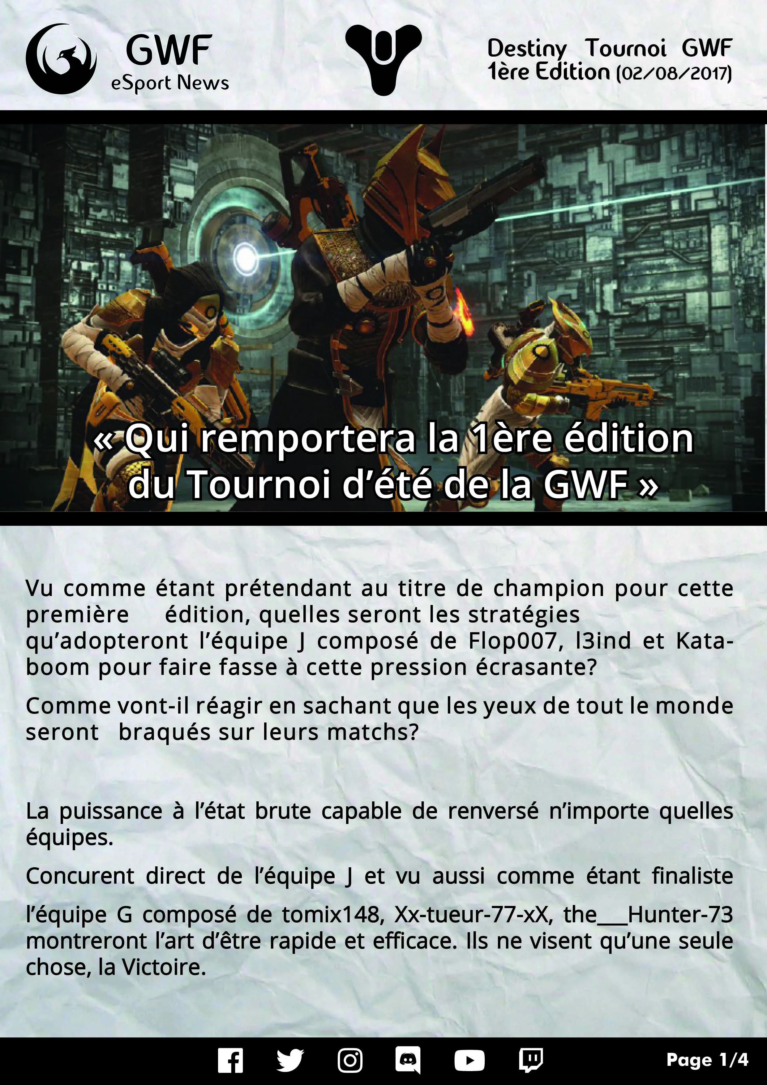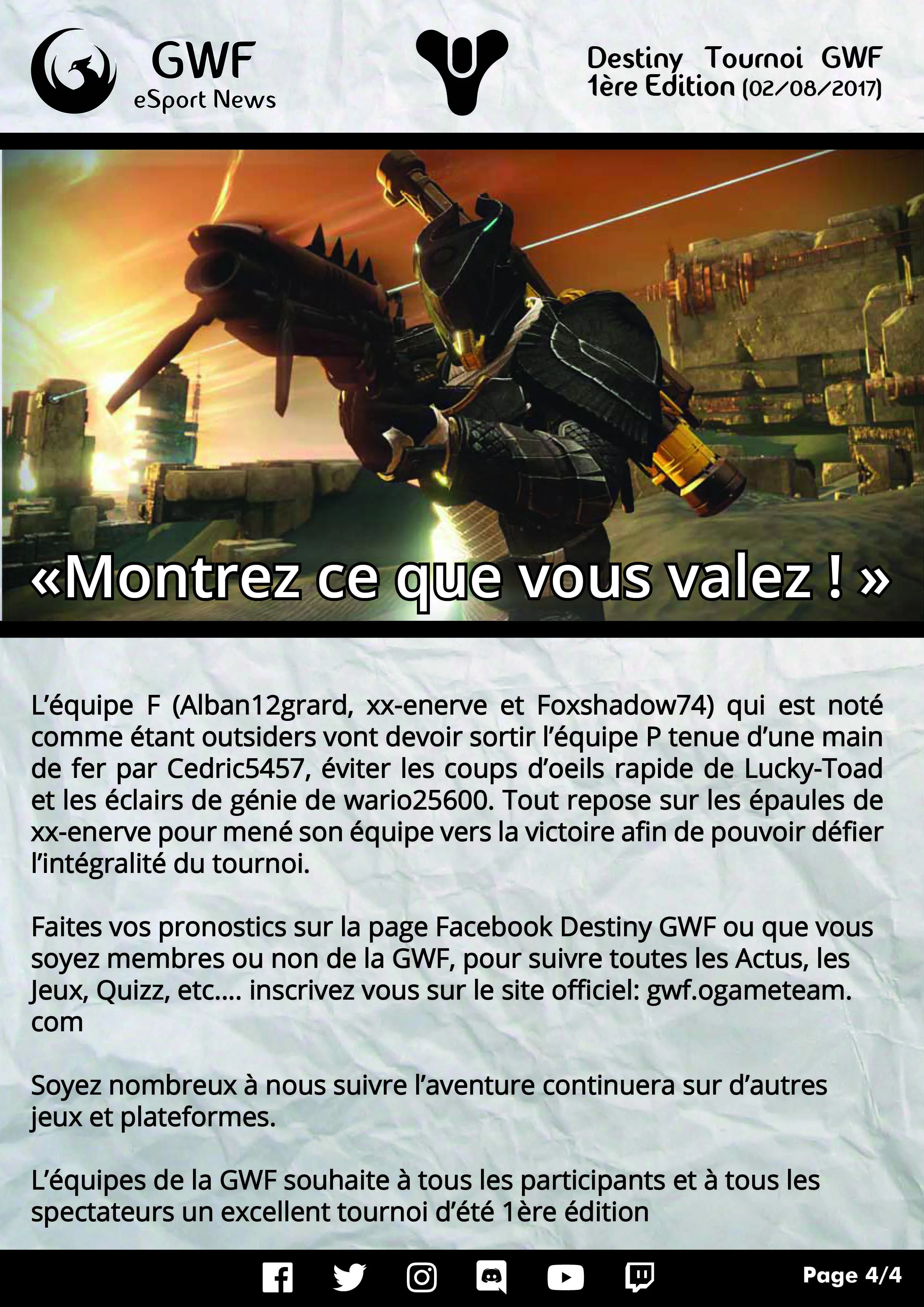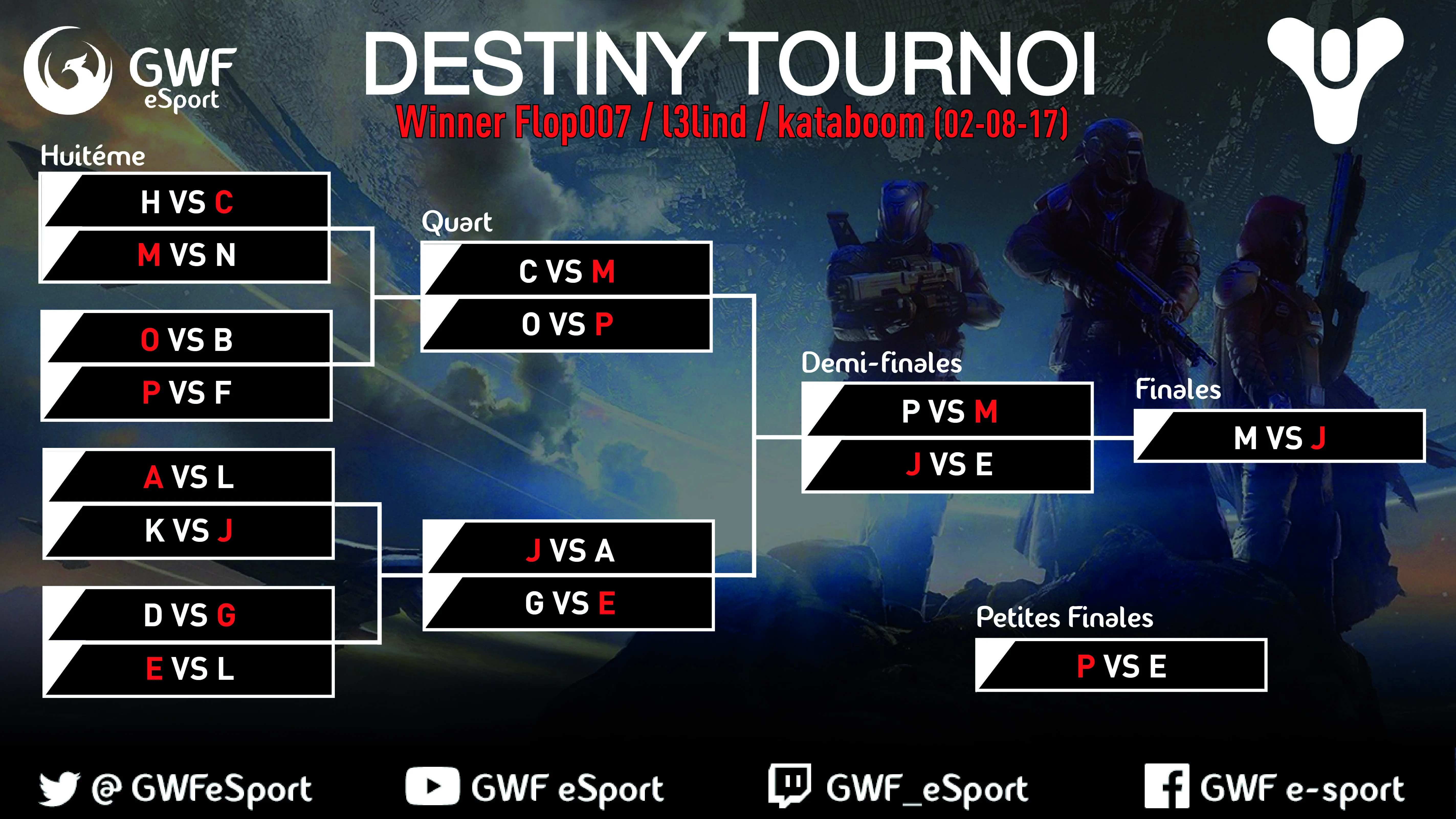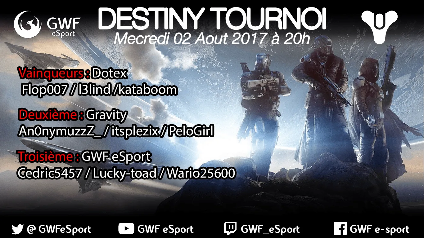 Nos Tournois Destiny sont organises par Cedric5457 et Psycause01. Tournois en 3vs3 sur PlayStation 4. Les tournois Destiny GWF sont commentes et analyses dans l'emission Debrief Destiny sur la chaine Twitch de la GWF.