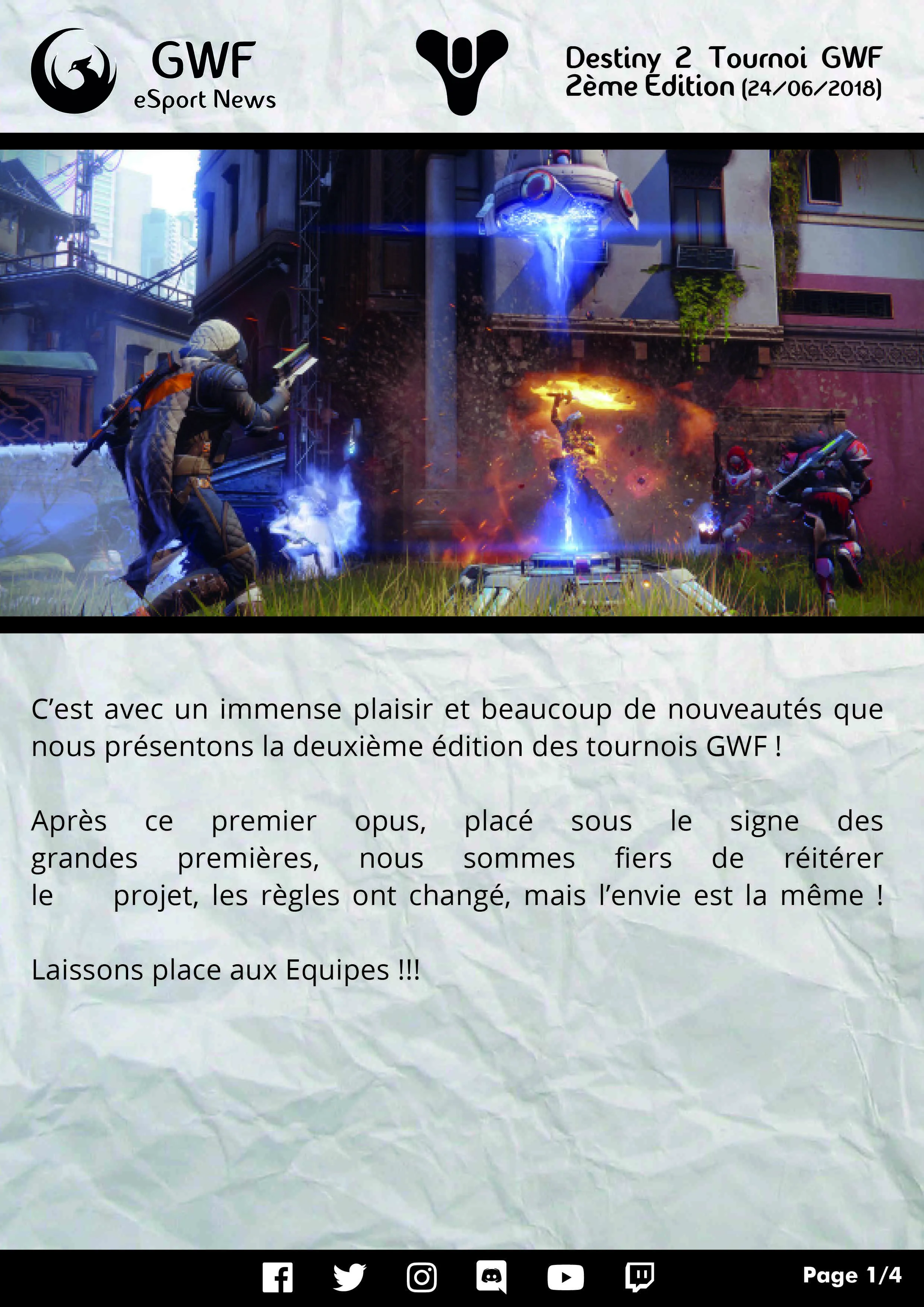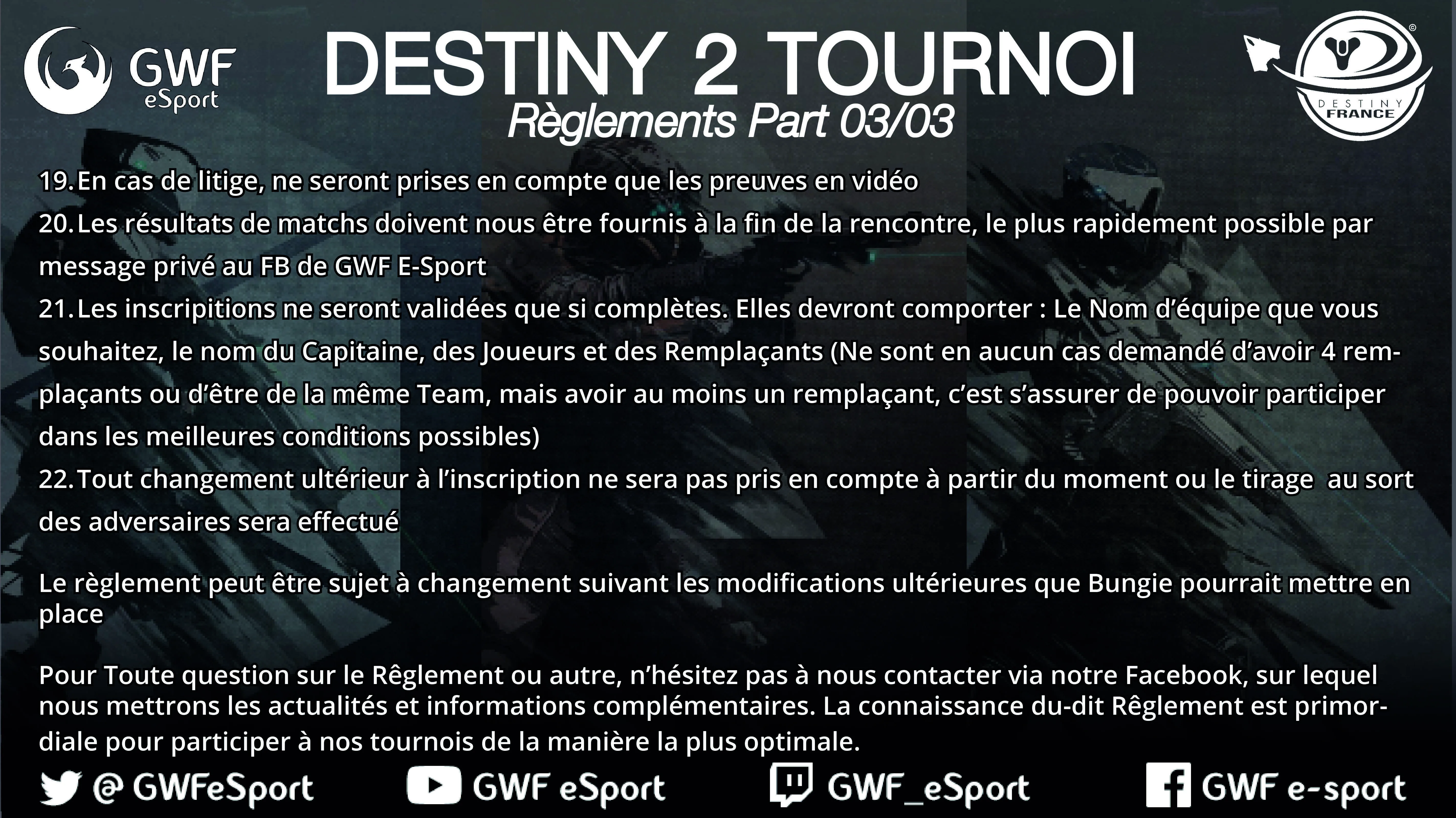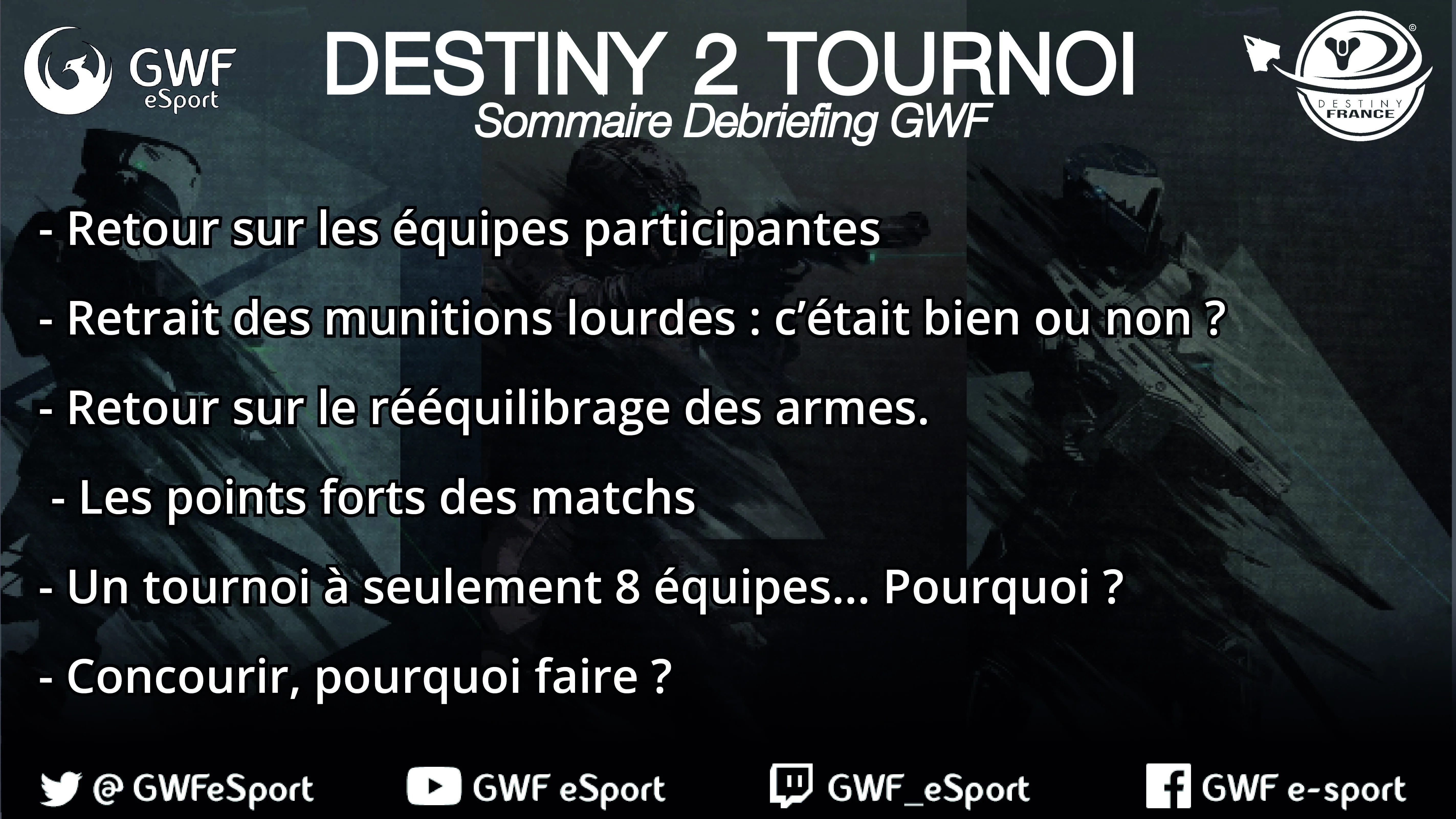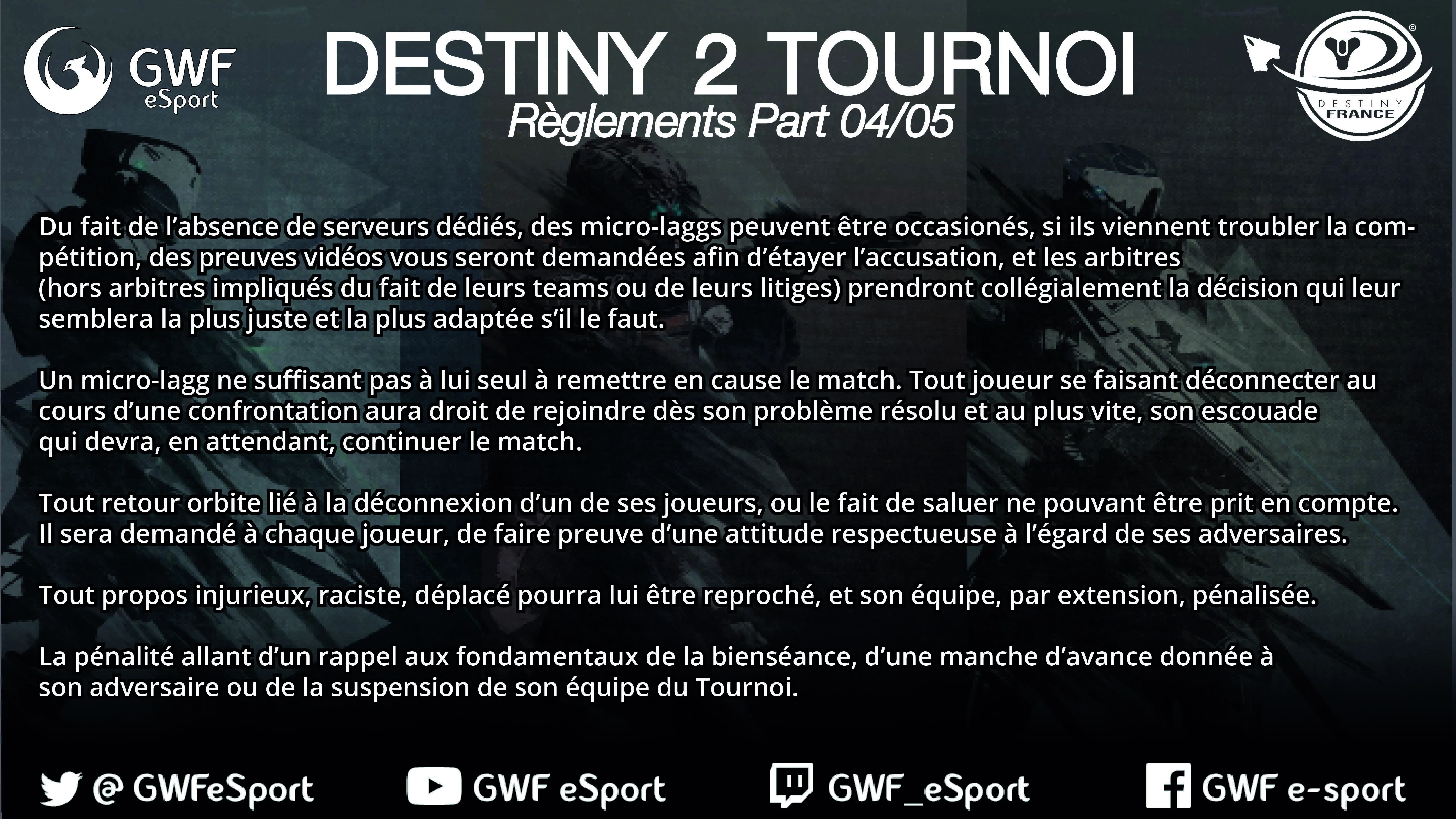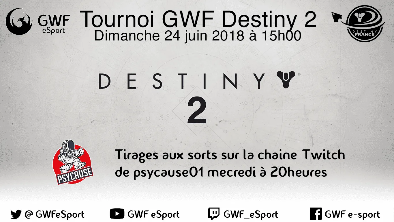 Nos Tournois Destiny 2 sont organises par Cedric5457 et Psycause01. Tournois en 3vs3 sur PlayStation 4. Les tournois Destiny 2 GWF sont commentes et analyses dans l'emission Debrief Destiny sur la chaine Twitch de la GWF.