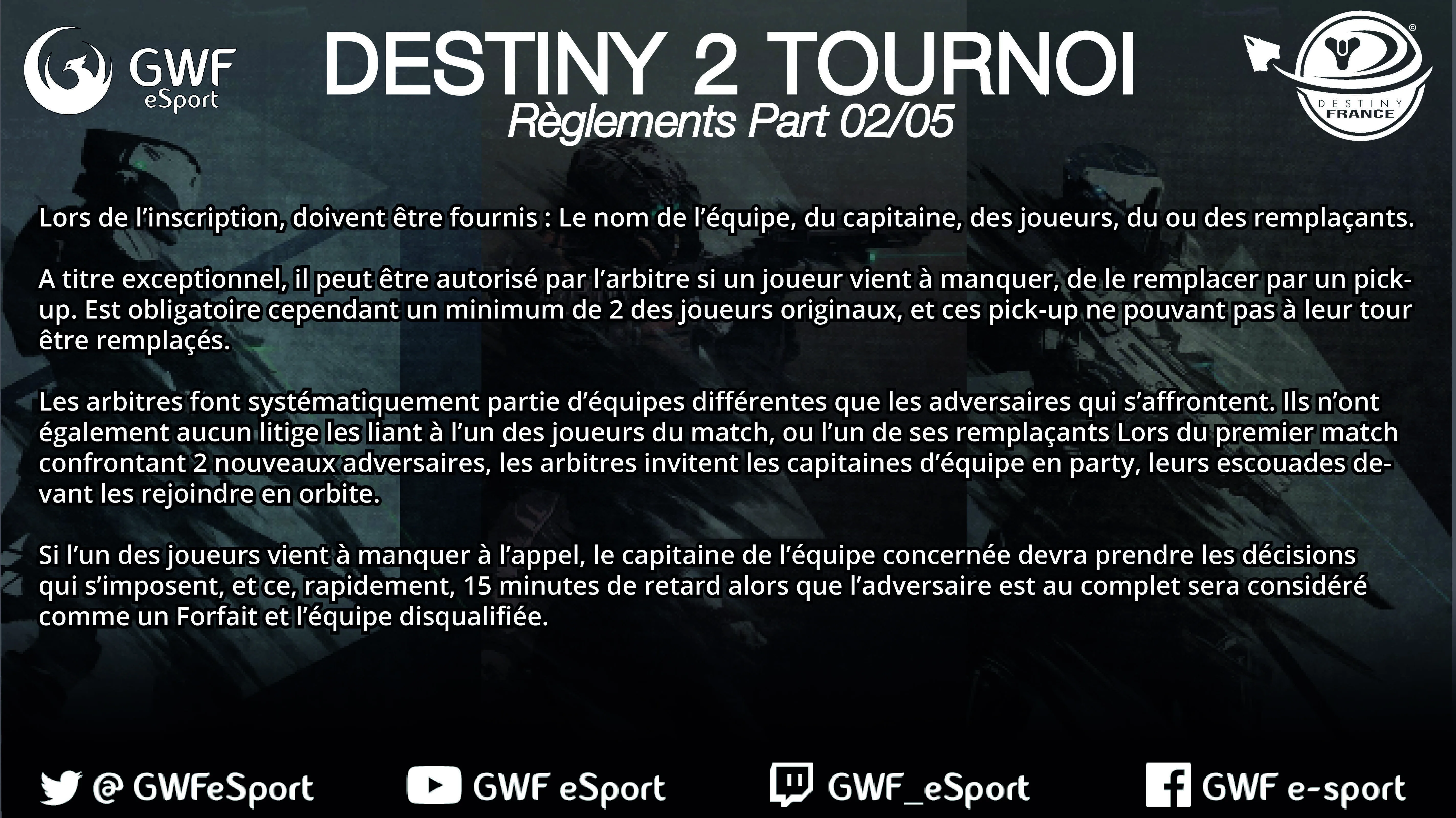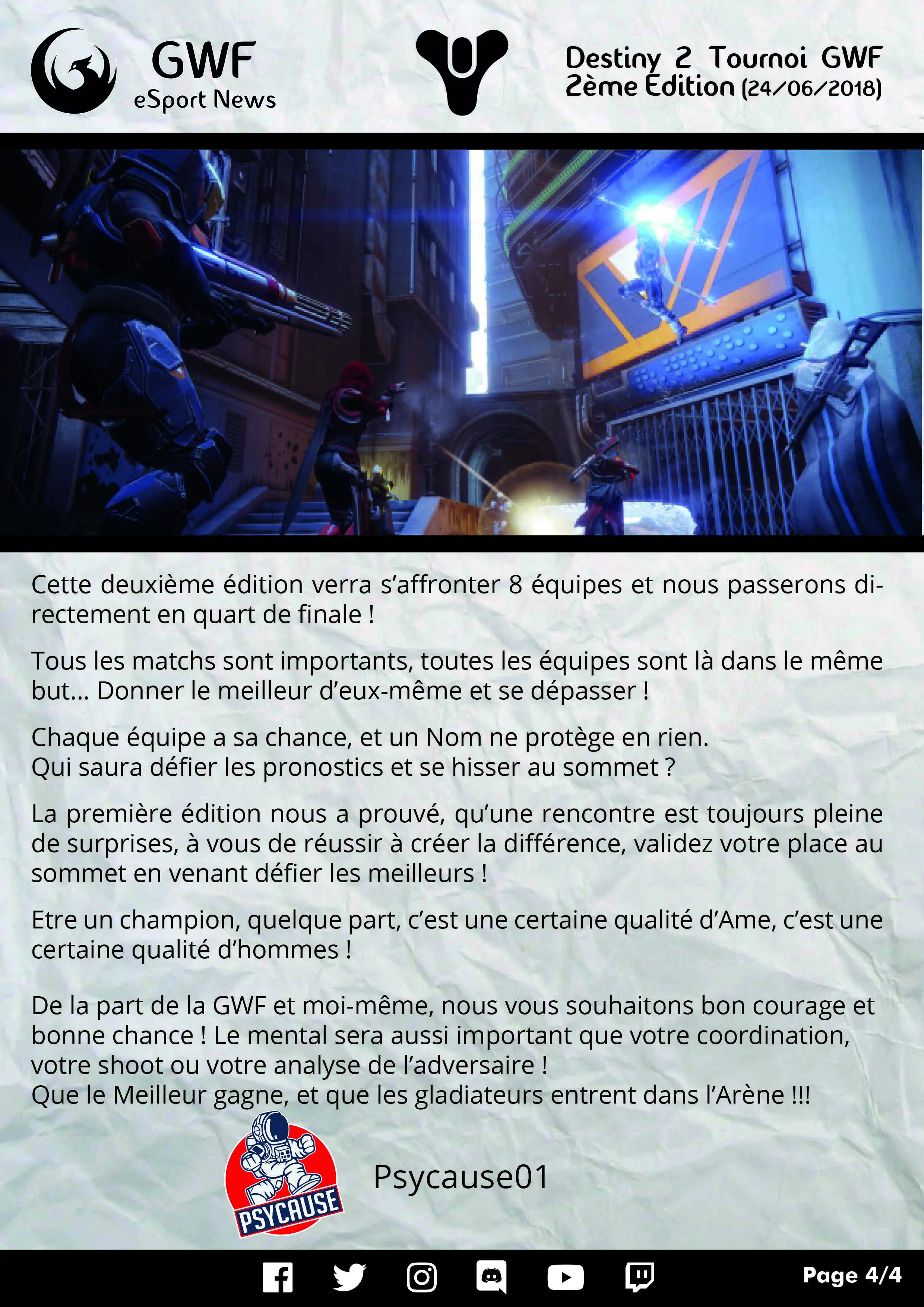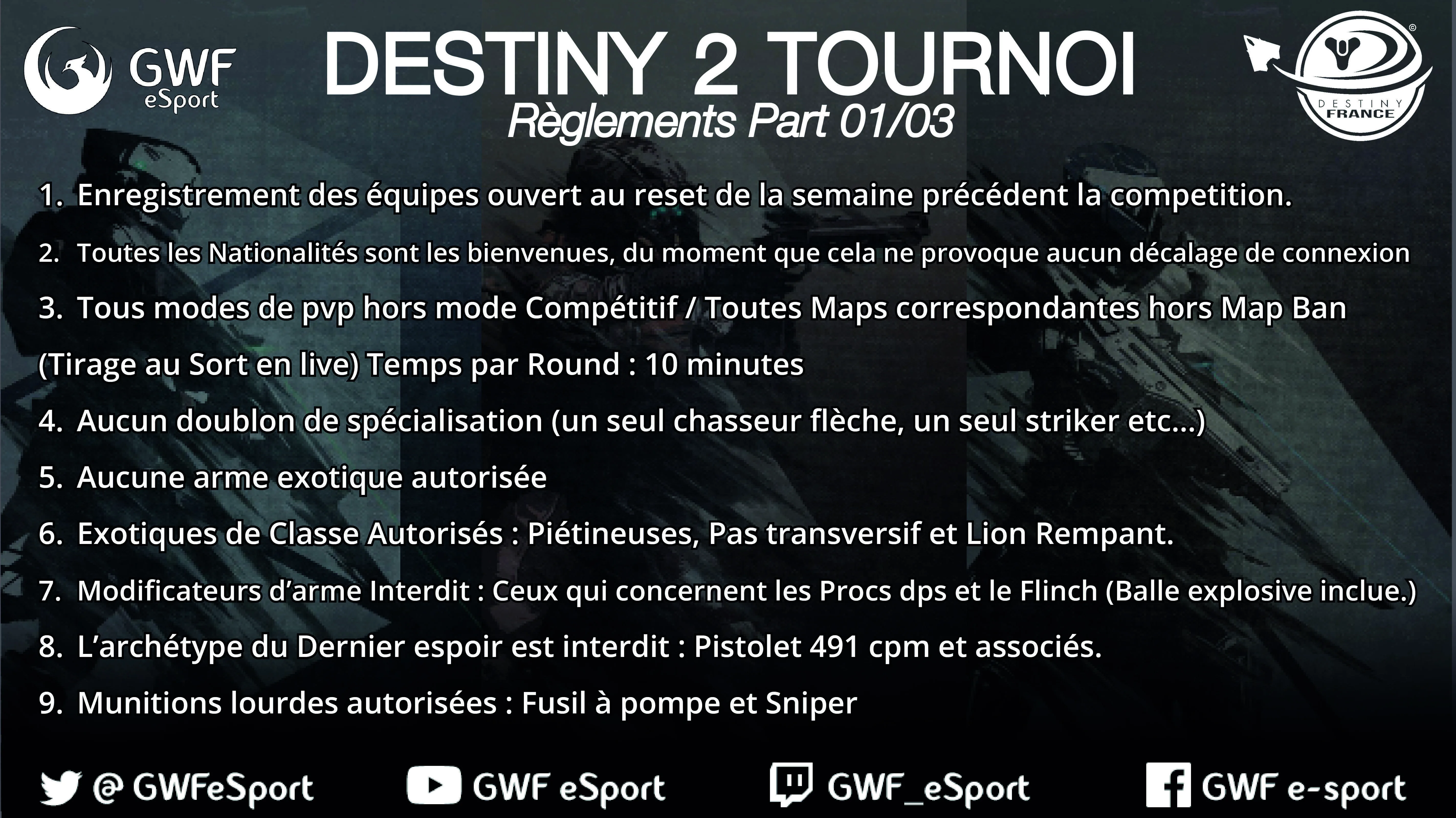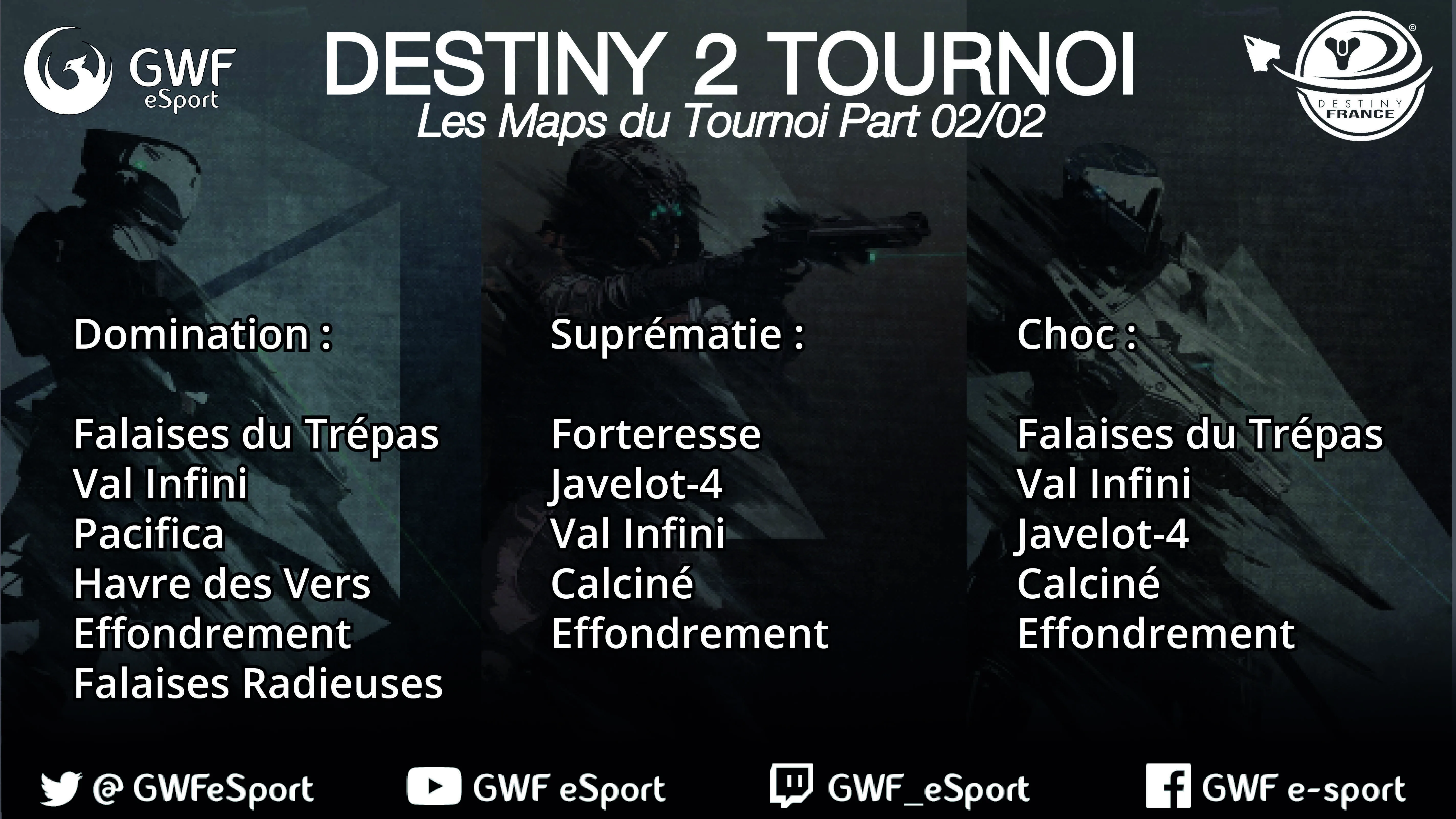 Nos Tournois Destiny 2 sont organises par Cedric5457 et Psycause01. Tournois en 3vs3 sur PlayStation 4. Les tournois Destiny 2 GWF sont commentes et analyses dans l'emission Debrief Destiny sur la chaine Twitch de la GWF.