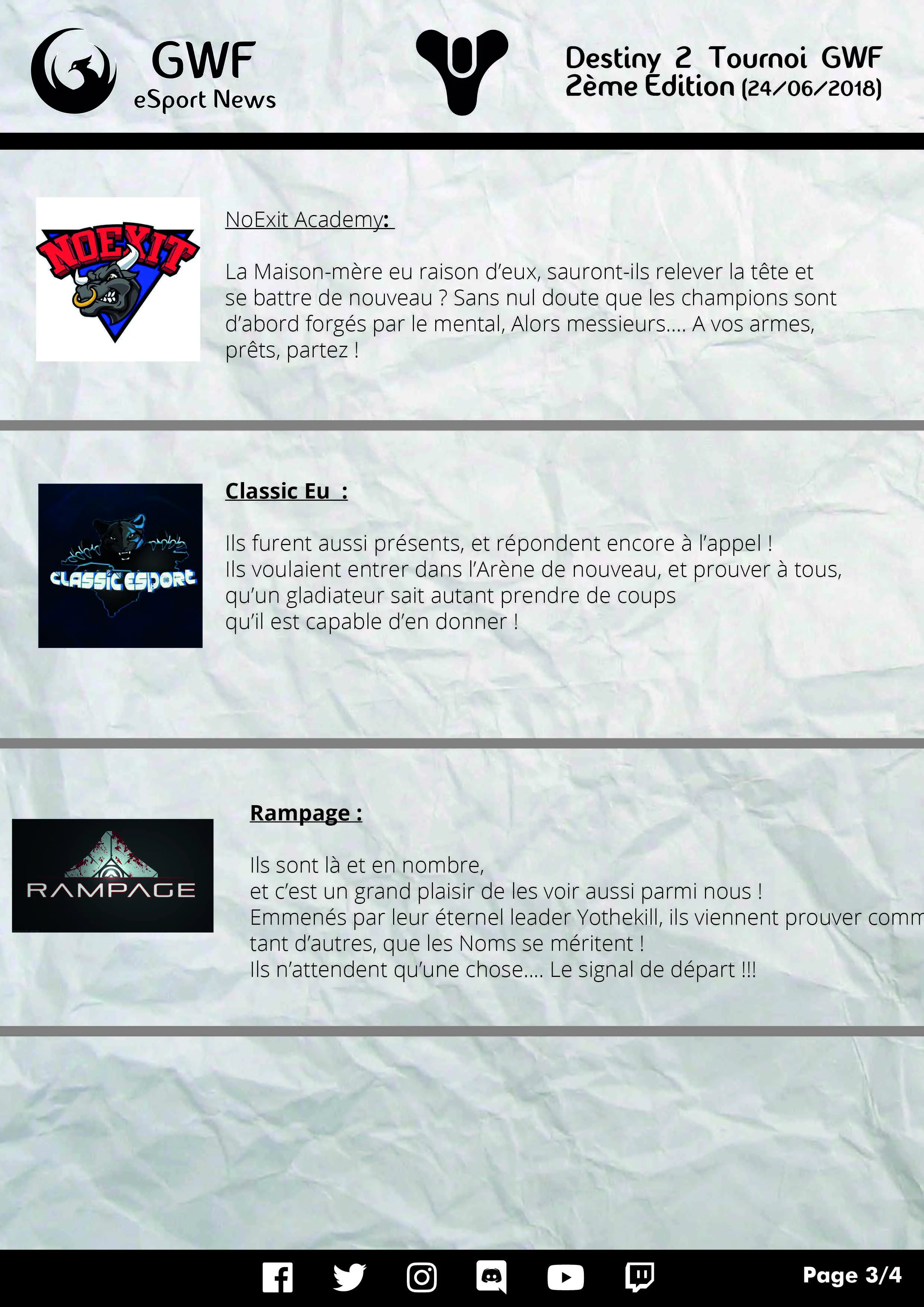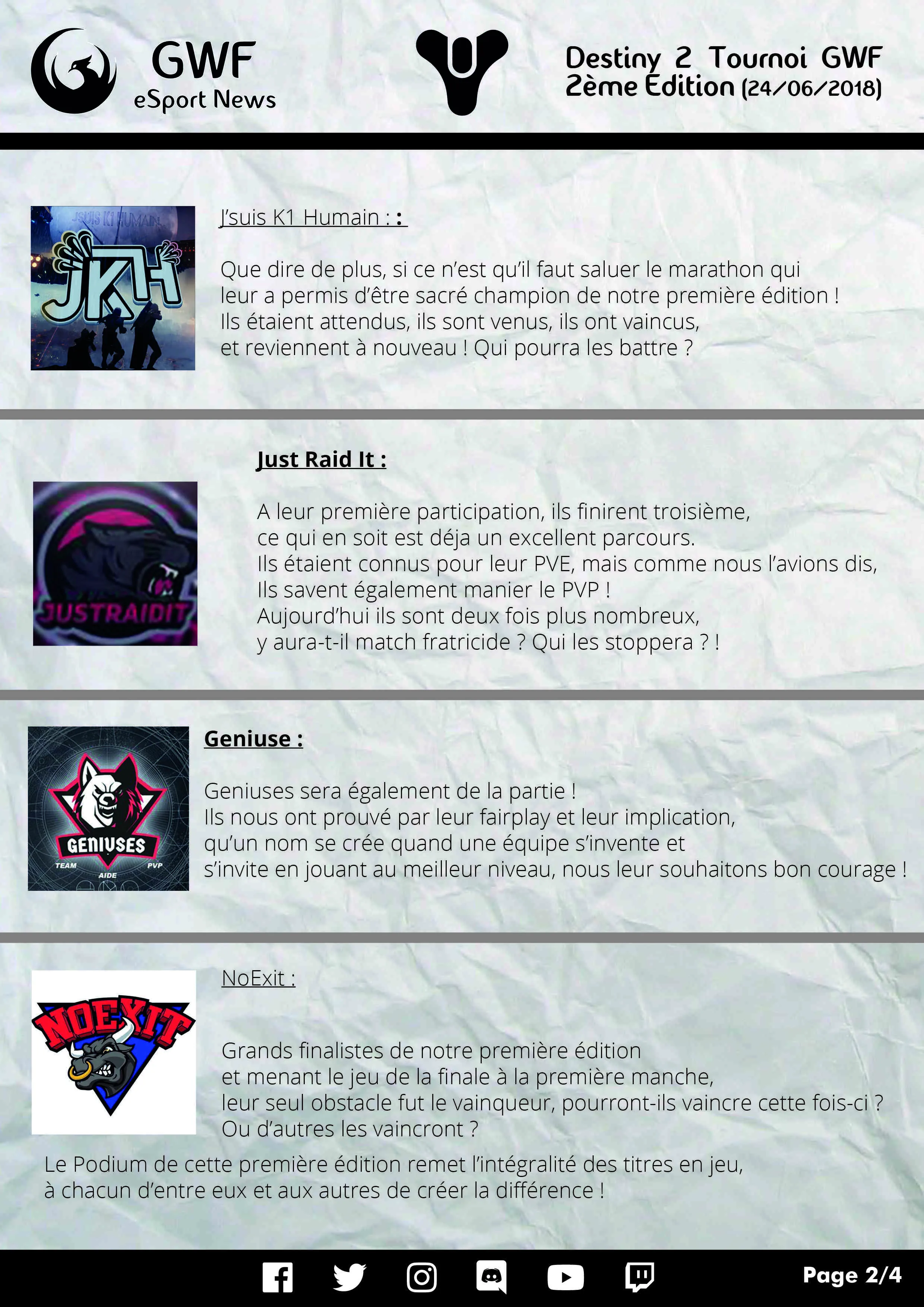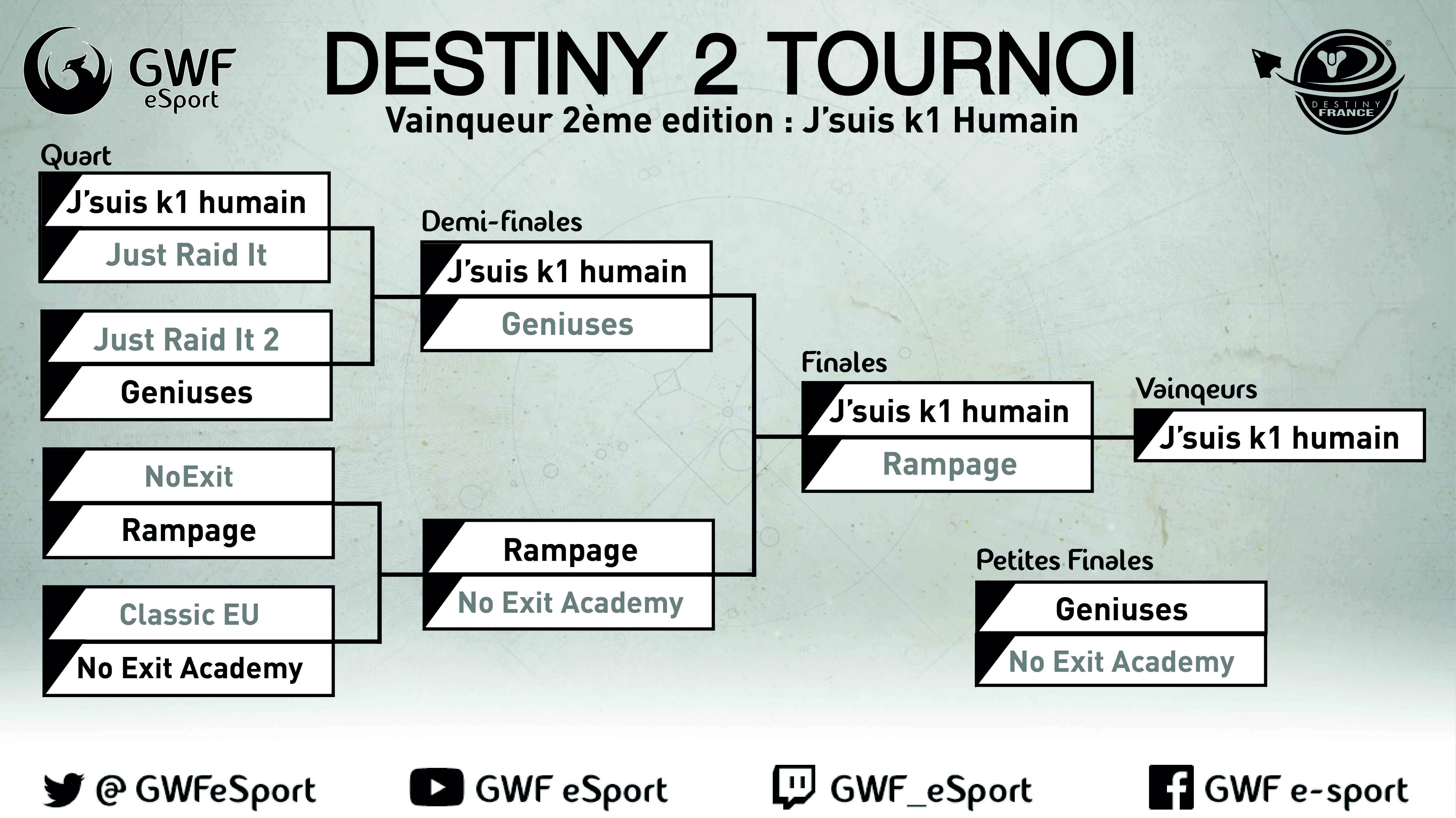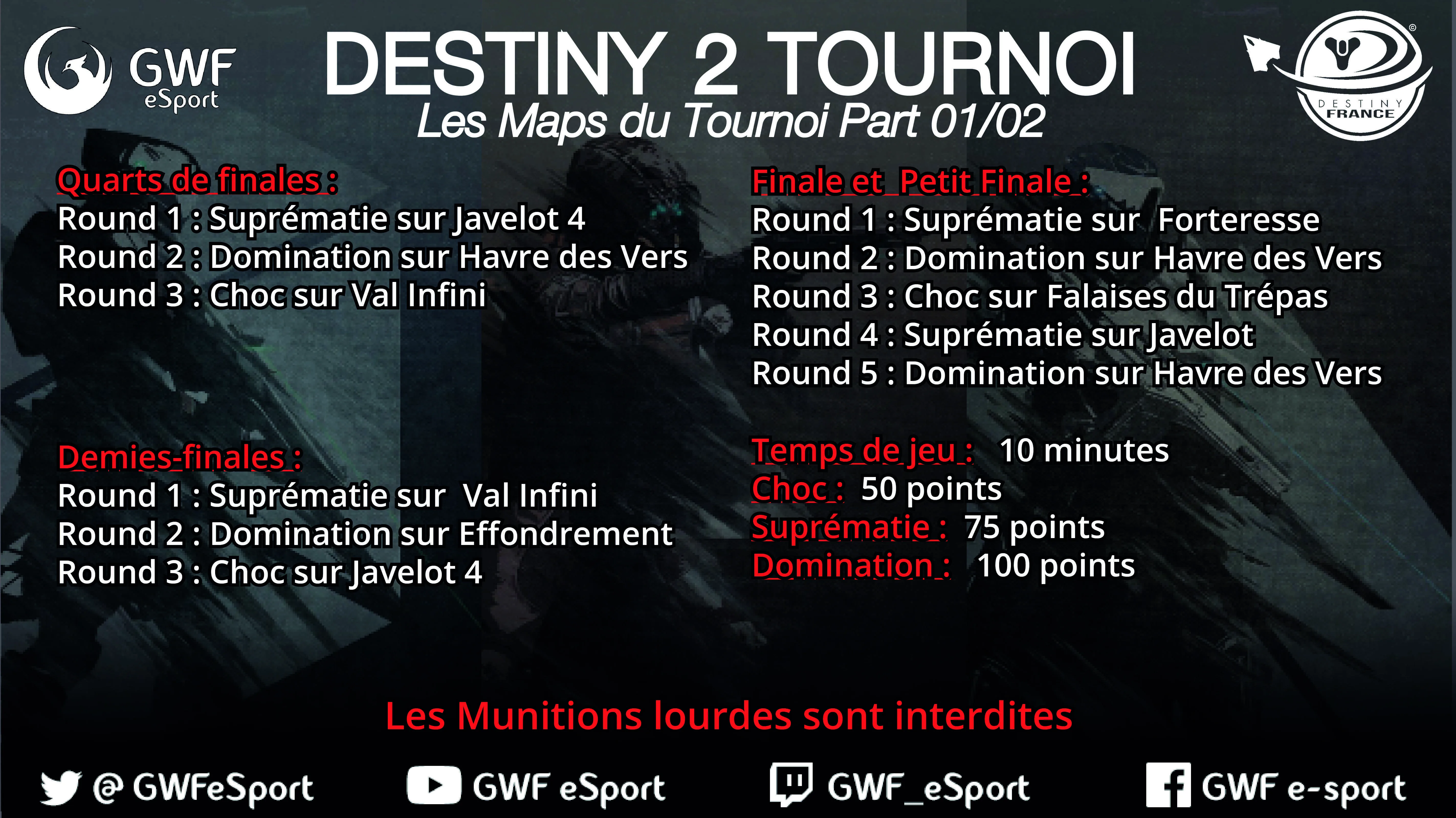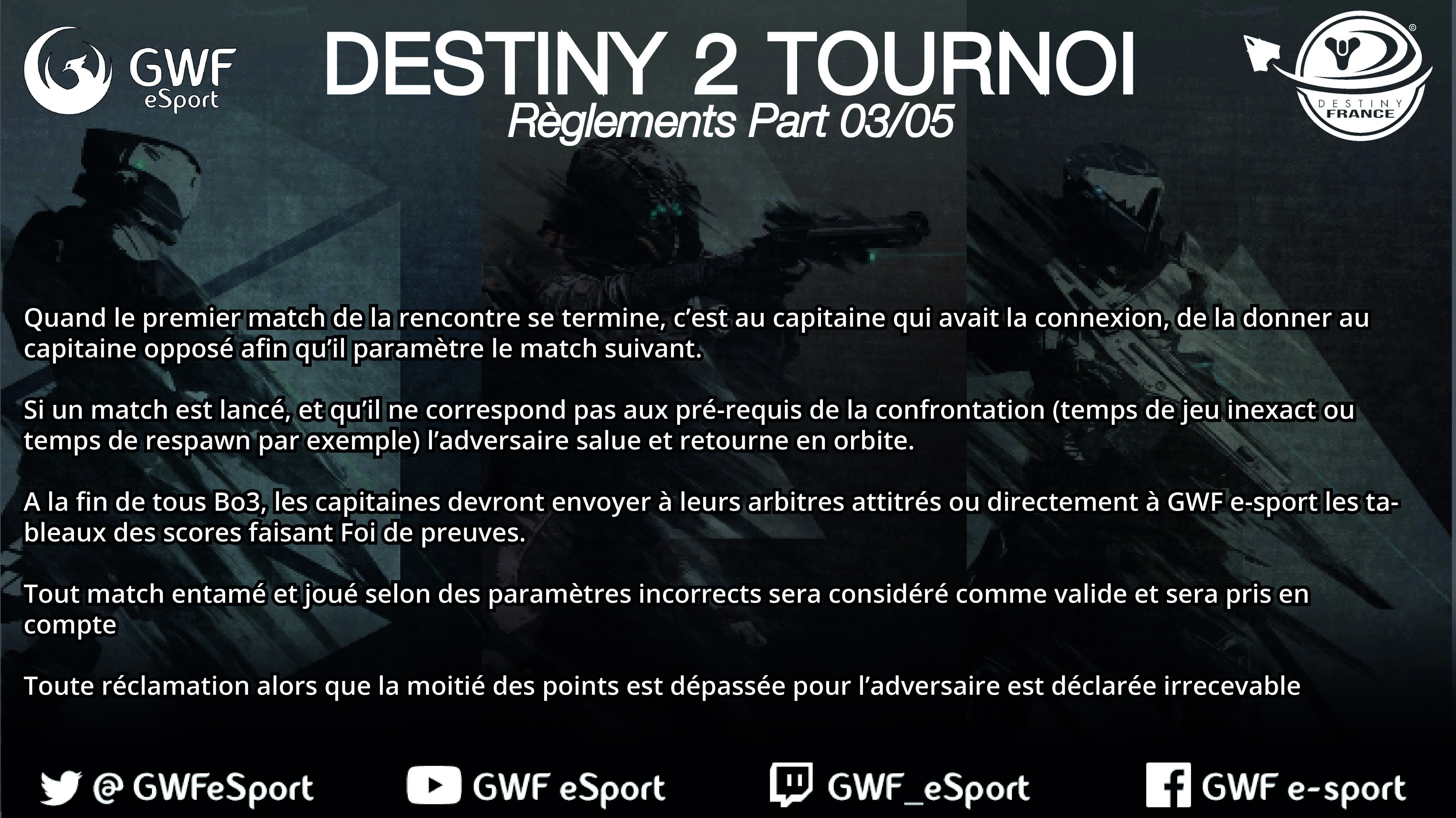 Nos Tournois Destiny 2 sont organises par Cedric5457 et Psycause01. Tournois en 3vs3 sur PlayStation 4. Les tournois Destiny 2 GWF sont commentes et analyses dans l'emission Debrief Destiny sur la chaine Twitch de la GWF.