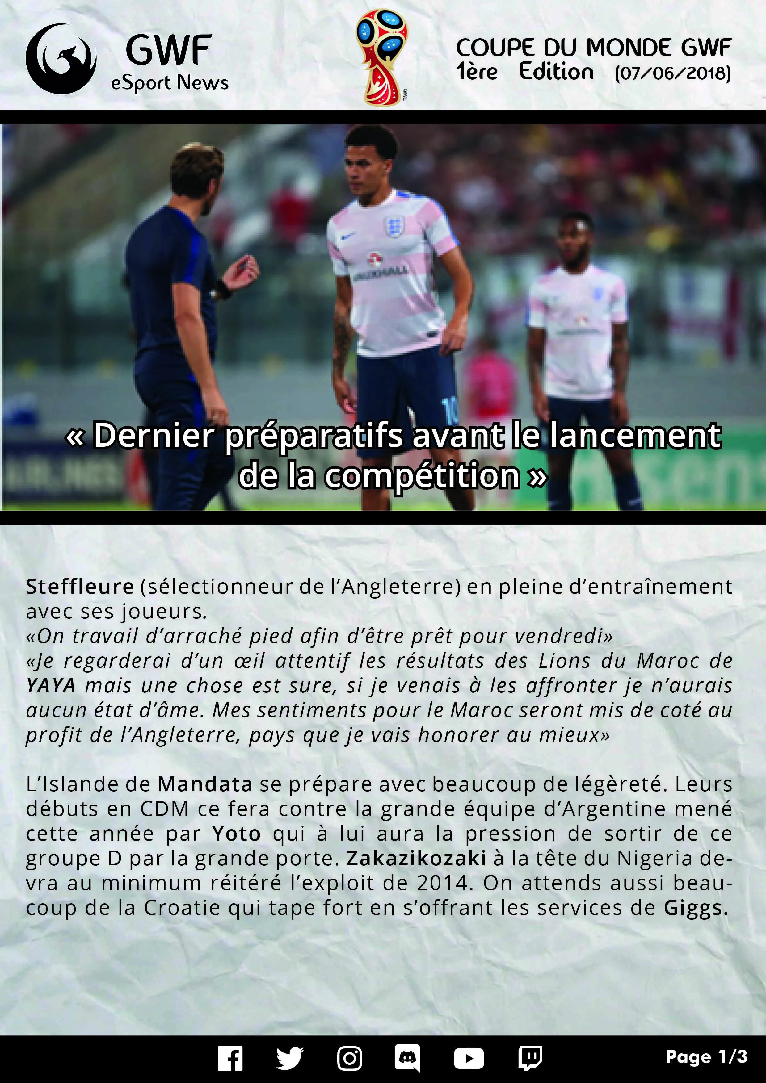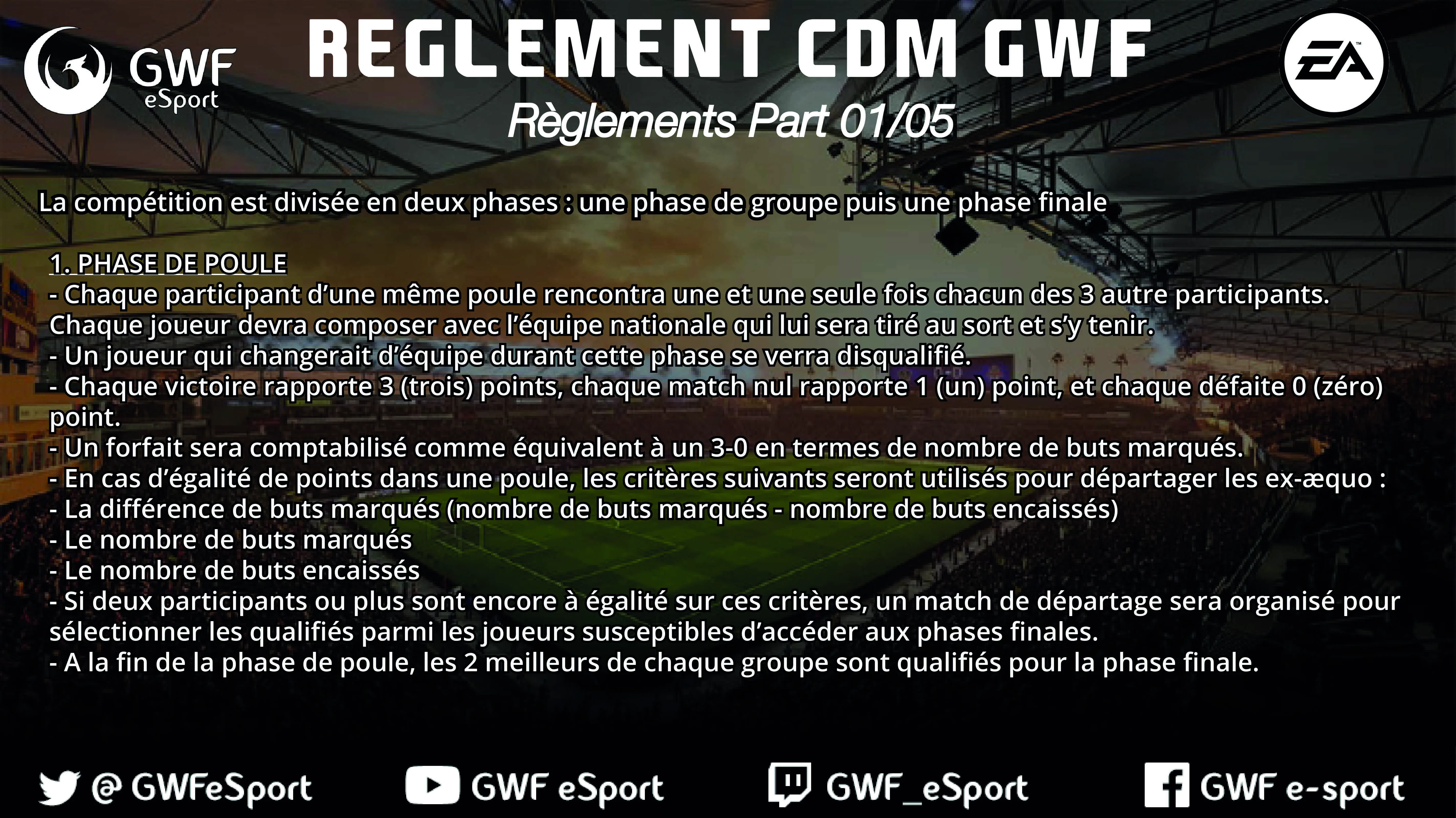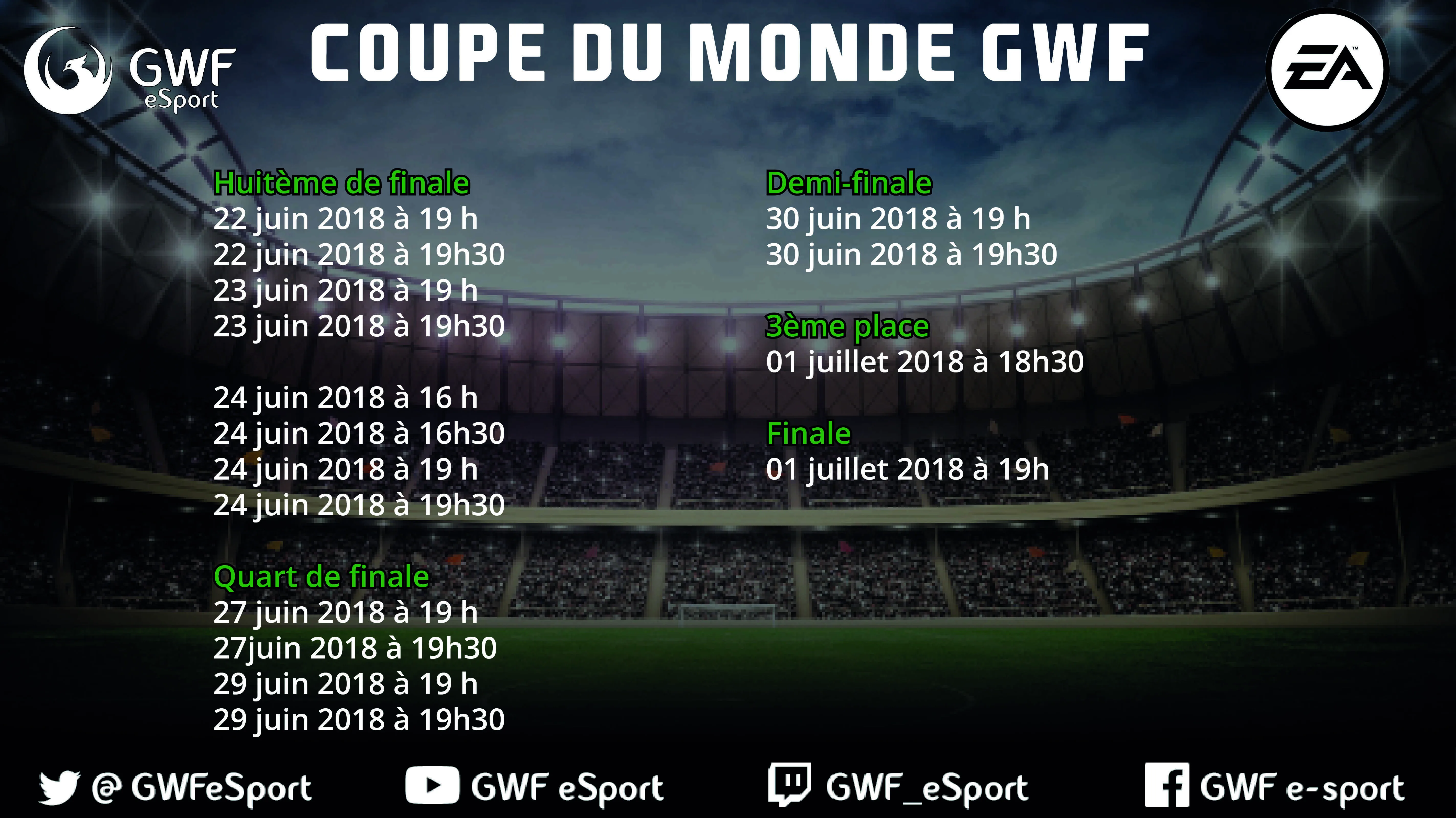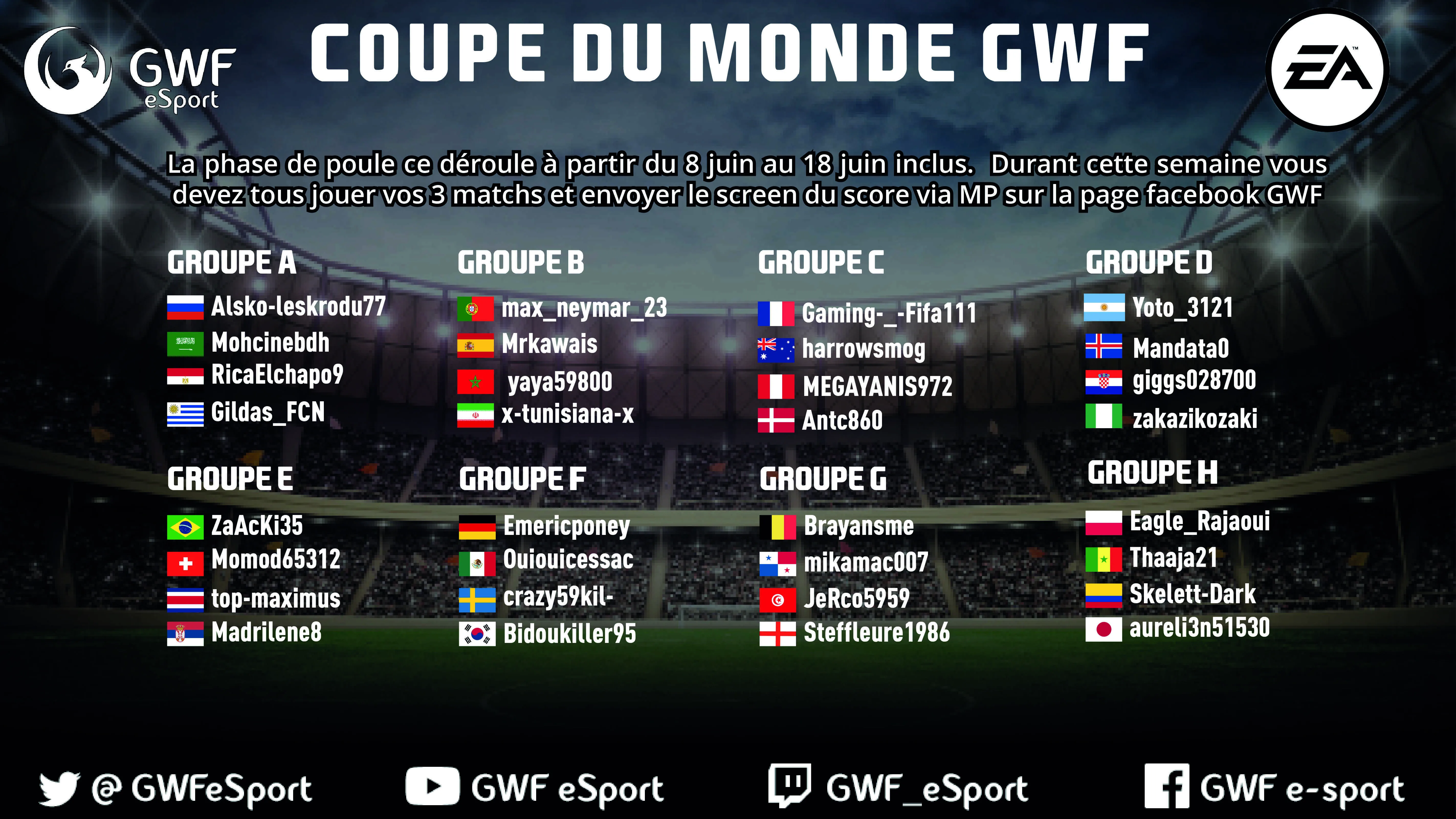 Nos Championnats Coupe du Monde GWF sont organises par SolidGTO. Le format reprend la Coupe du Monde FIFA avec des groupes, des phases eliminatoires et une grande finale. Les matchs sont commentes en direct sur la chaine Twitch de la GWF.