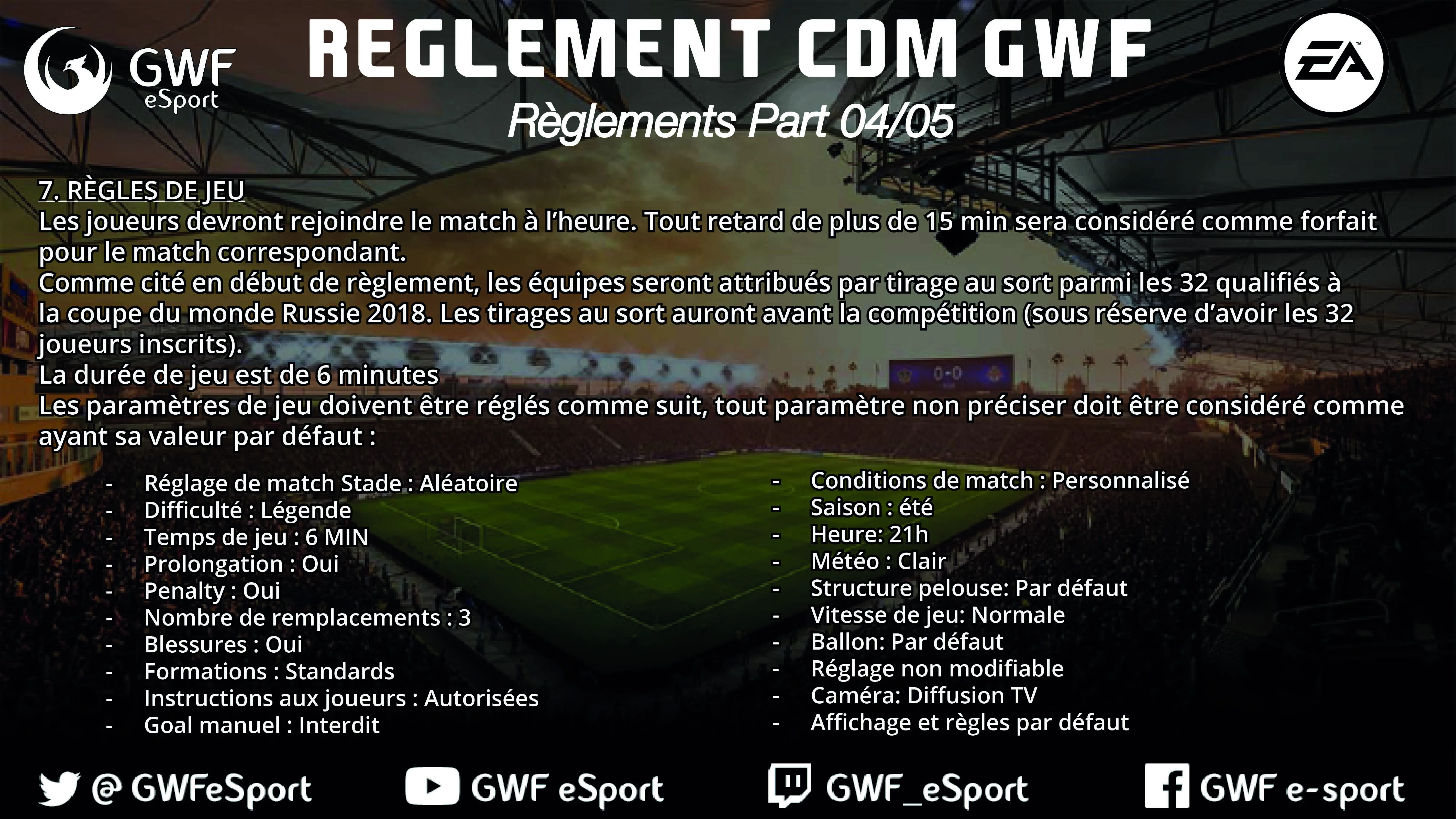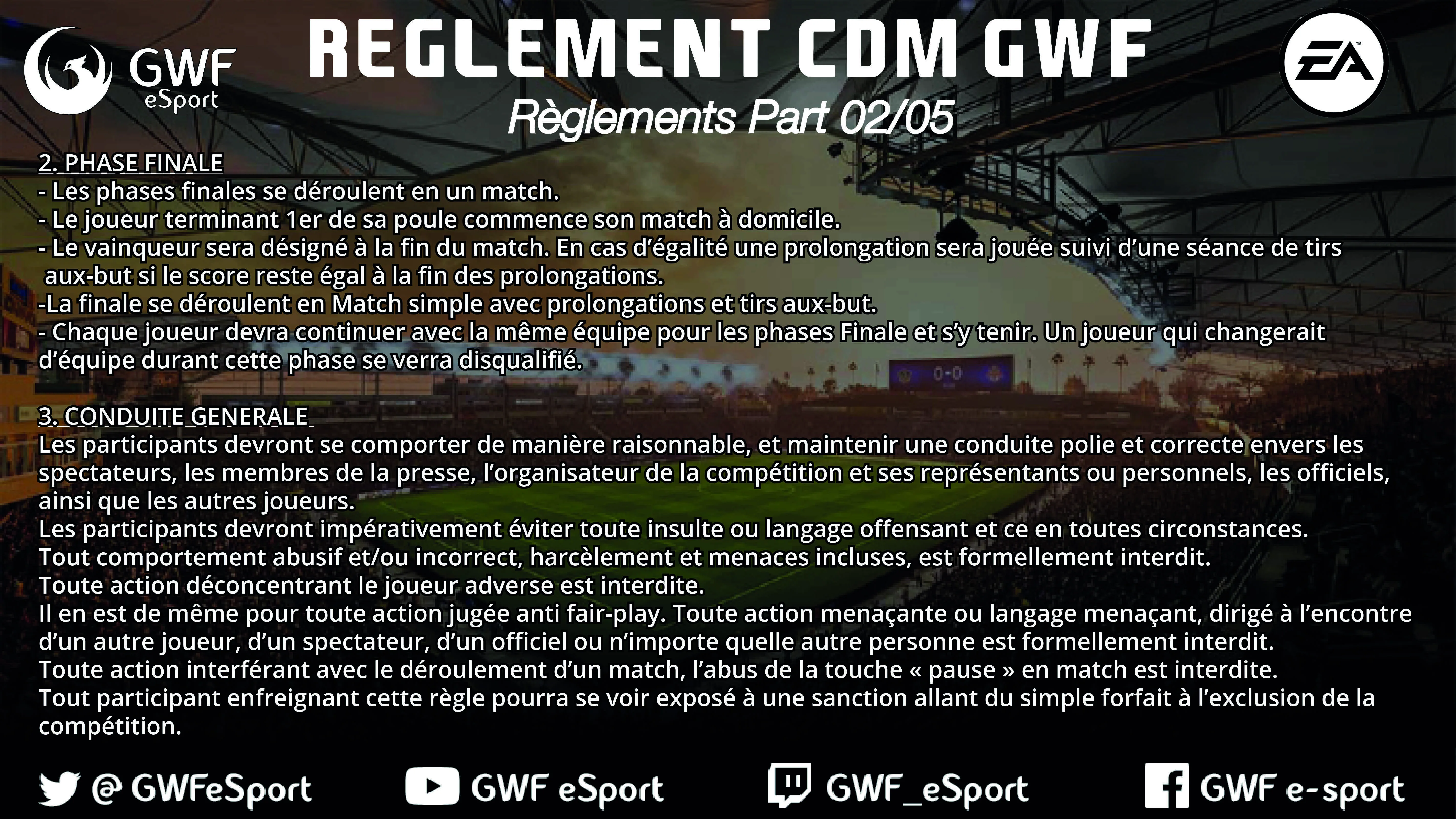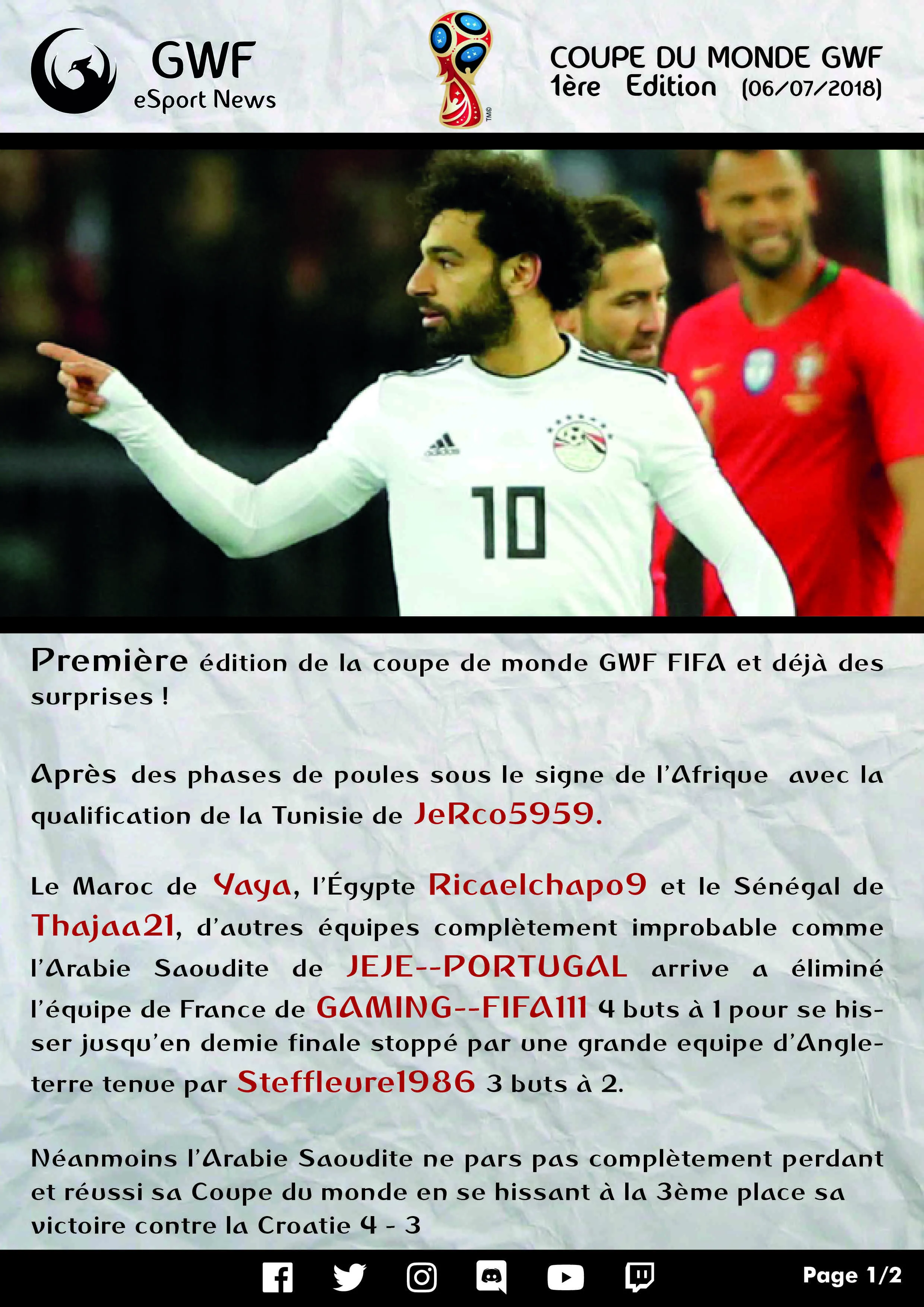 Nos Championnats Coupe du Monde GWF sont organises par SolidGTO. Le format reprend la Coupe du Monde FIFA avec des groupes, des phases eliminatoires et une grande finale. Les matchs sont commentes en direct sur la chaine Twitch de la GWF.