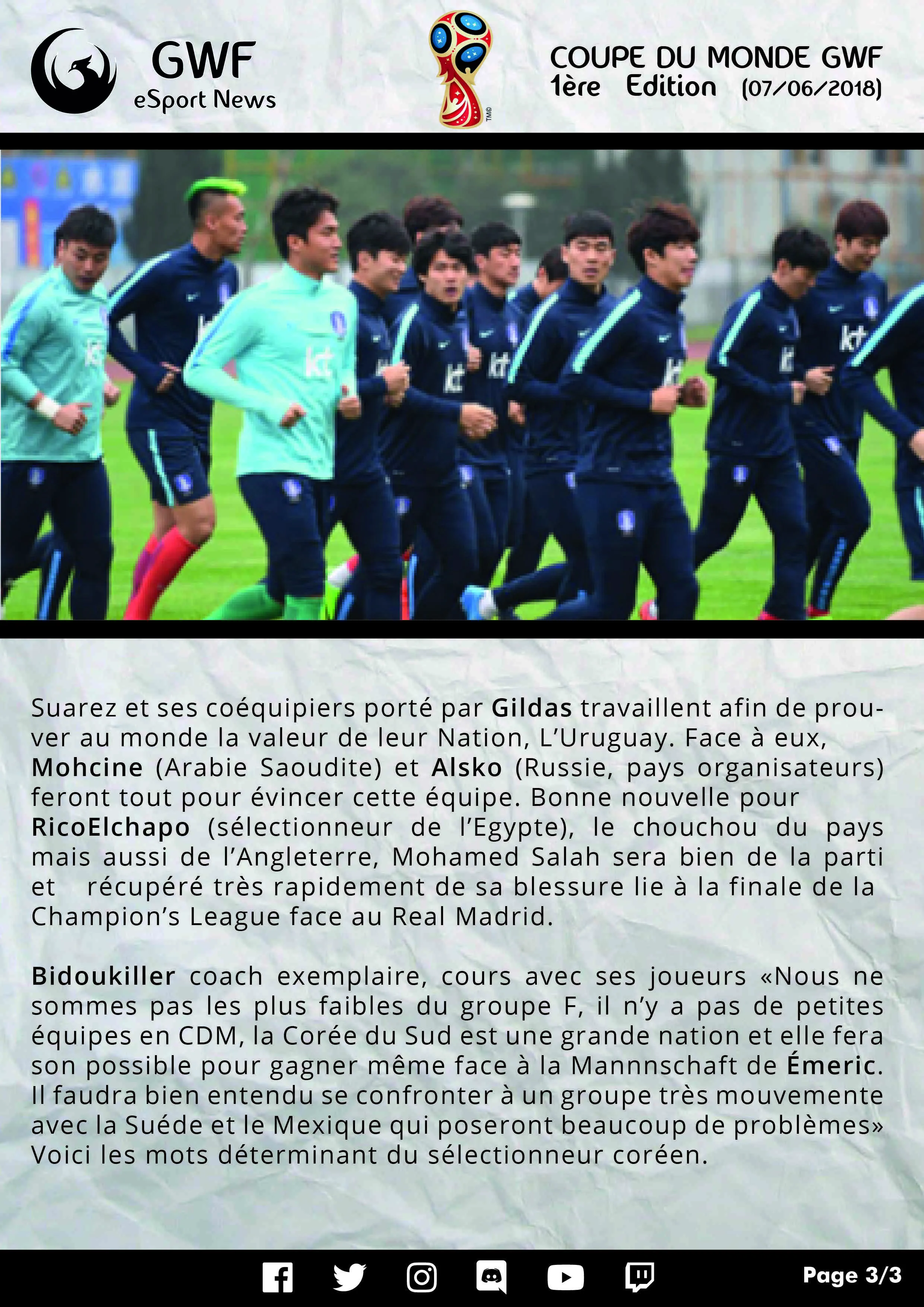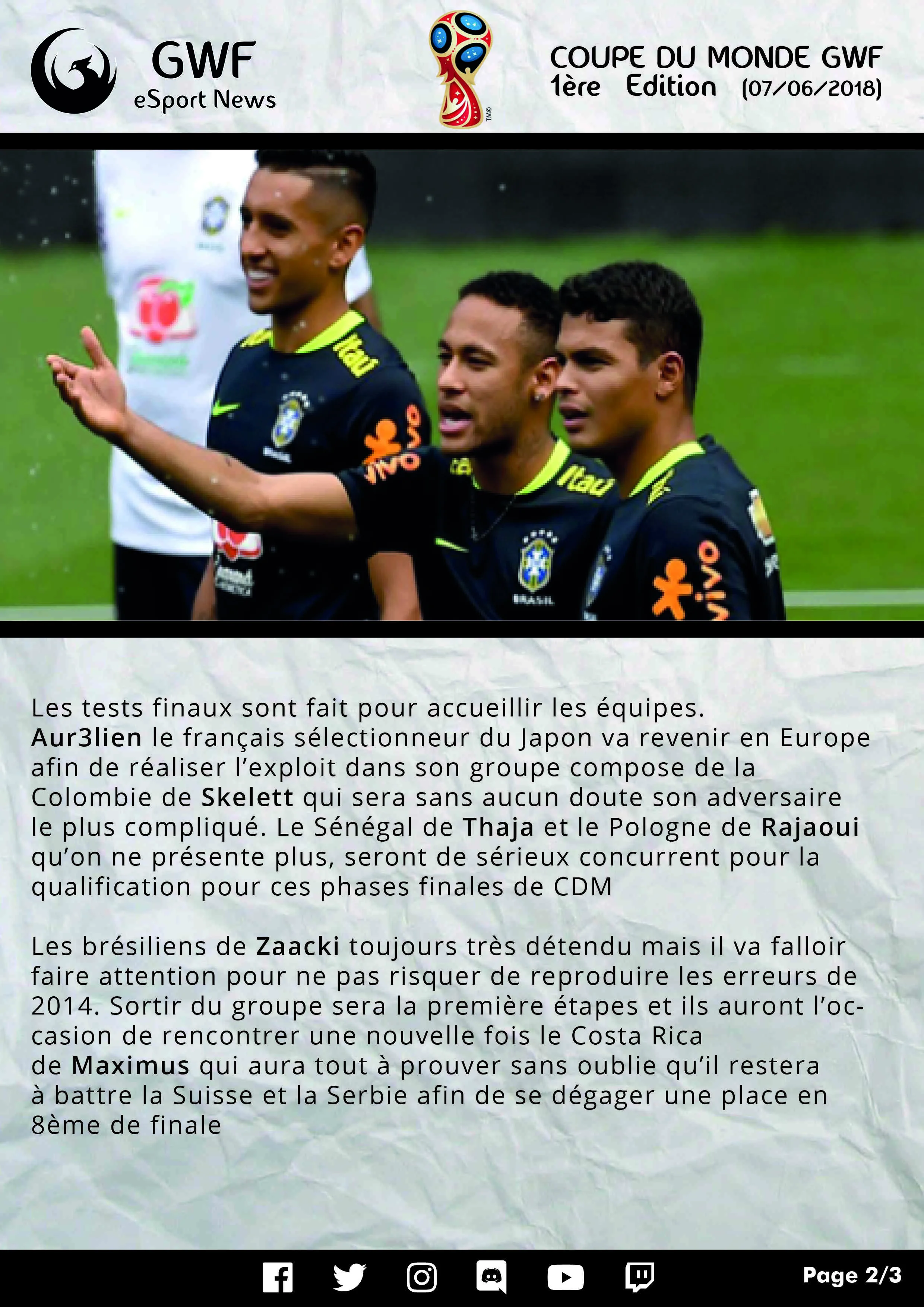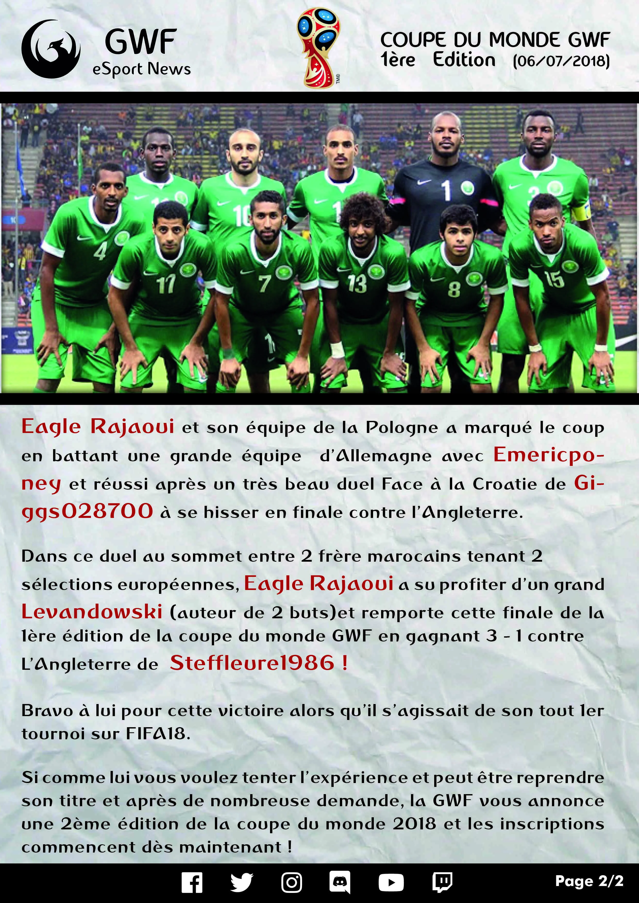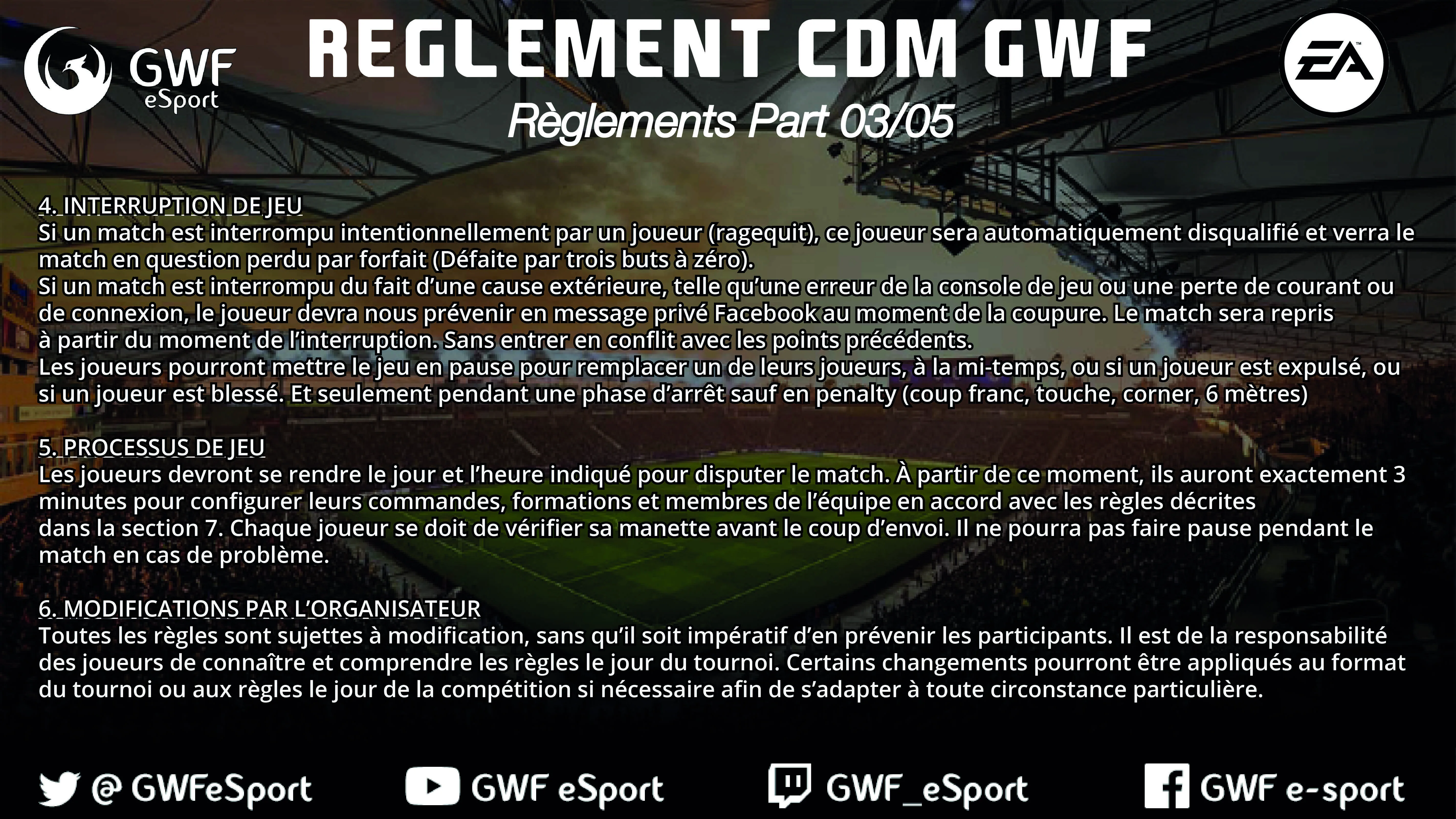 Nos Championnats Coupe du Monde GWF sont organises par SolidGTO. Le format reprend la Coupe du Monde FIFA avec des groupes, des phases eliminatoires et une grande finale. Les matchs sont commentes en direct sur la chaine Twitch de la GWF.