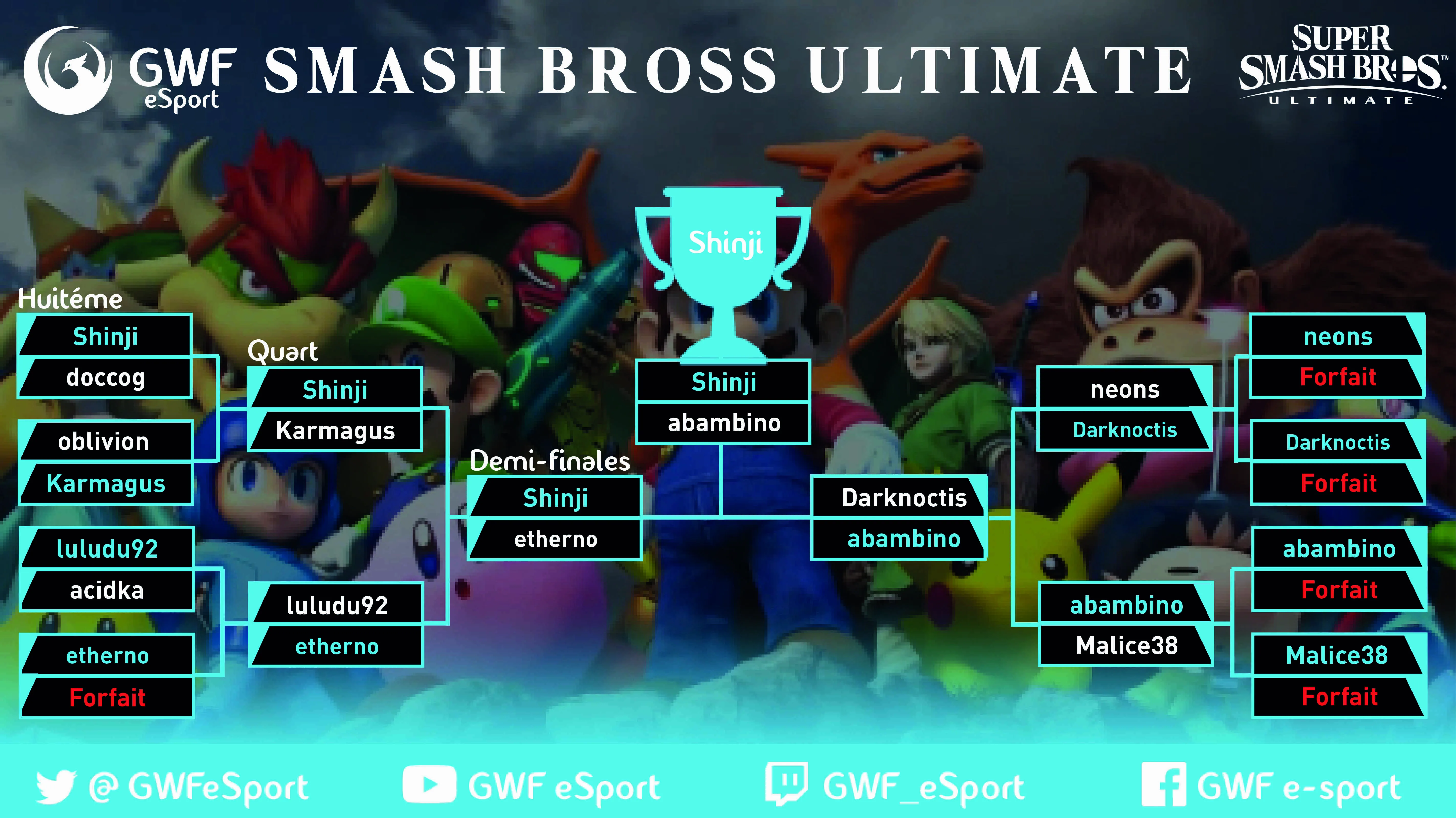 Le GWF Smash Tournament est organise par Johey. Format 1vs1 sur Super Smash Bros. Ultimate sur Nintendo Switch. Le tournoi est diffuse sur la chaine Twitch de la GWF.
